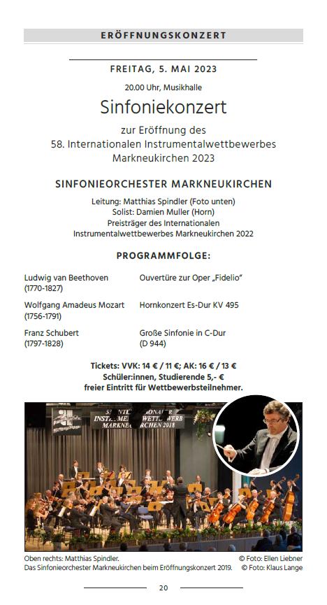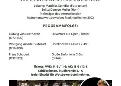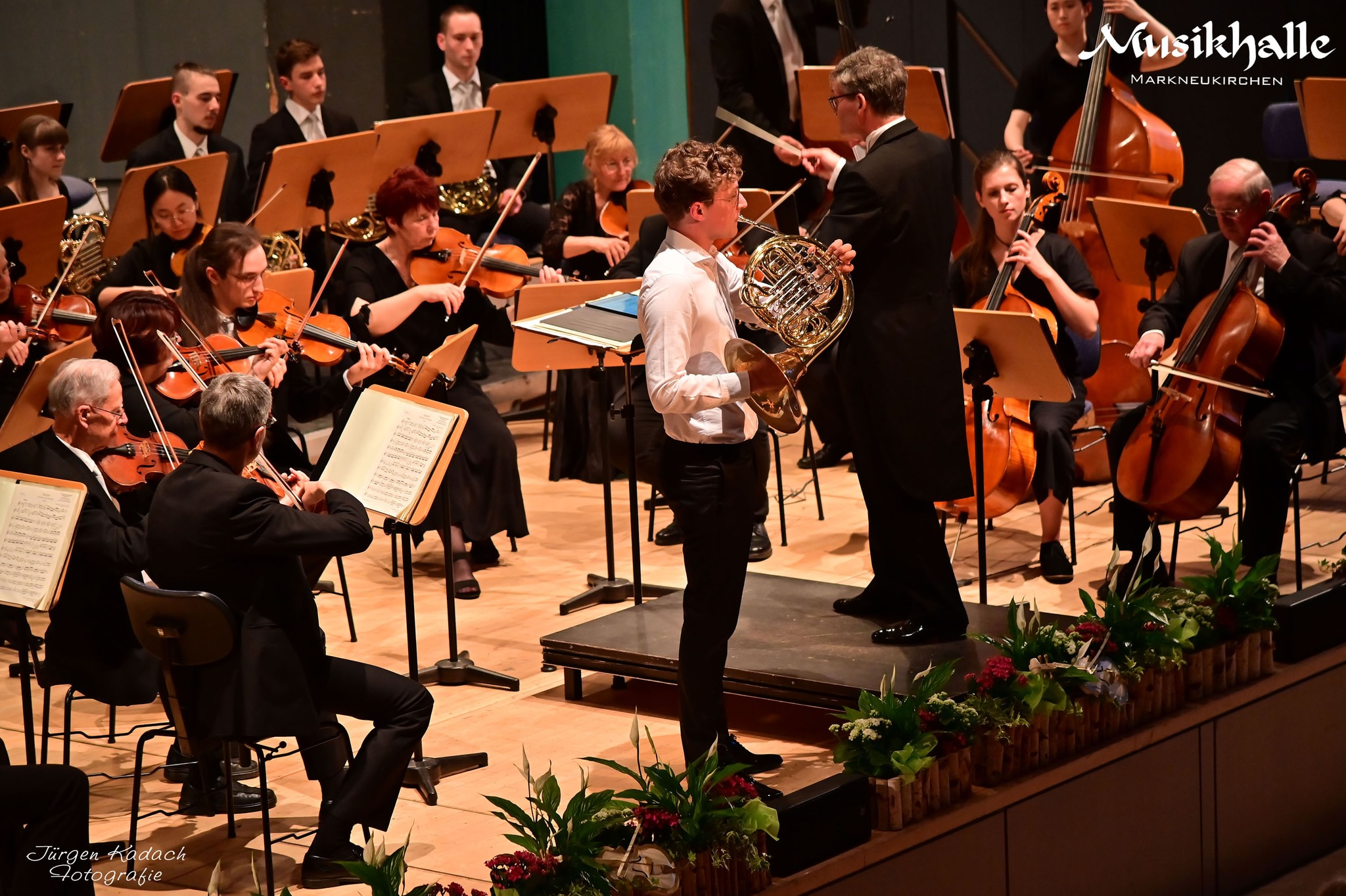 Auch beim Hornkonzert Es-Dur, KV 495 von W.A. Mozart konnte man die Musizierfreude des Orchesters, das durchaus ein ebenbürtiger Partner des Solisten Damien Muller aus Luxemburg darstellte, erleben. Sowohl das ausdruckstarke und virtuose Spiel des jungen Hornisten und Preisträgers des IIW 2022 als auch die souveräne und dezente Begleitung des Orchesters, das wunderbar mit dem Solisten korrespondierte, begeisterte das Publikum.